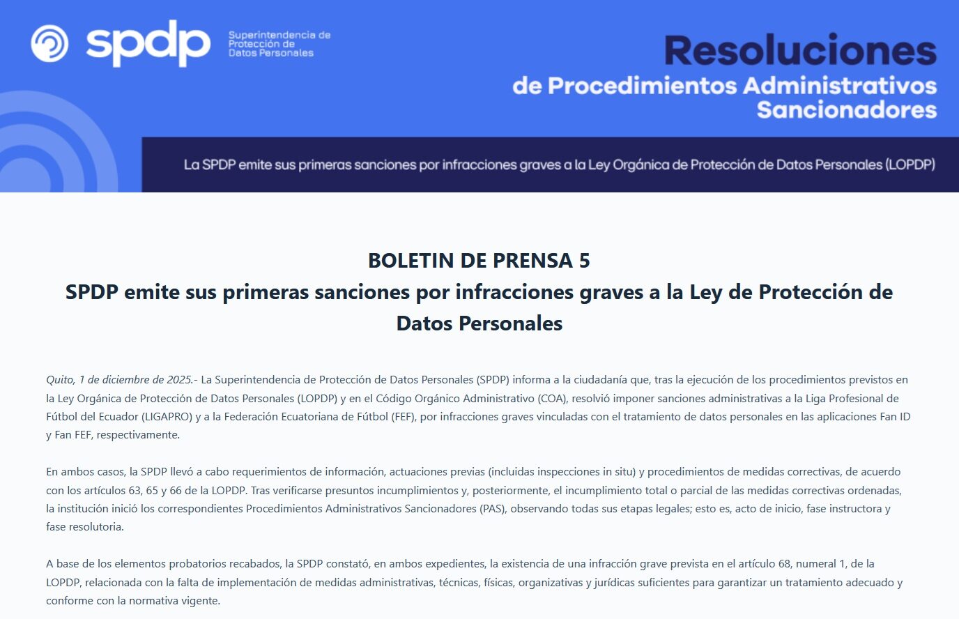 La protección de datos personales en Ecuador ha adquirido una relevancia central a partir de la entrada en vigencia y aplicación efectiva de la Ley Orgánica de Protección de Datos Personales (LOPDP). Recientemente, la Superintendencia de Protección de Datos Personales (SPDP) impuso sanciones administrativas significativas a la Liga Profesional de Fútbol del Ecuador (LigaPro) y a la Federación Ecuatoriana de Fútbol (FEF), marcando un precedente importante para todas las organizaciones públicas y privadas del país.